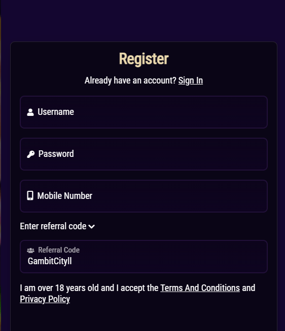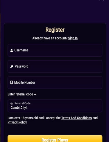 To begin, click on the "PLAY NOW" button located at the top of this page for GAMBIT CITY V2. This action will take you to the sign-up page where you can set up your unique username and password.